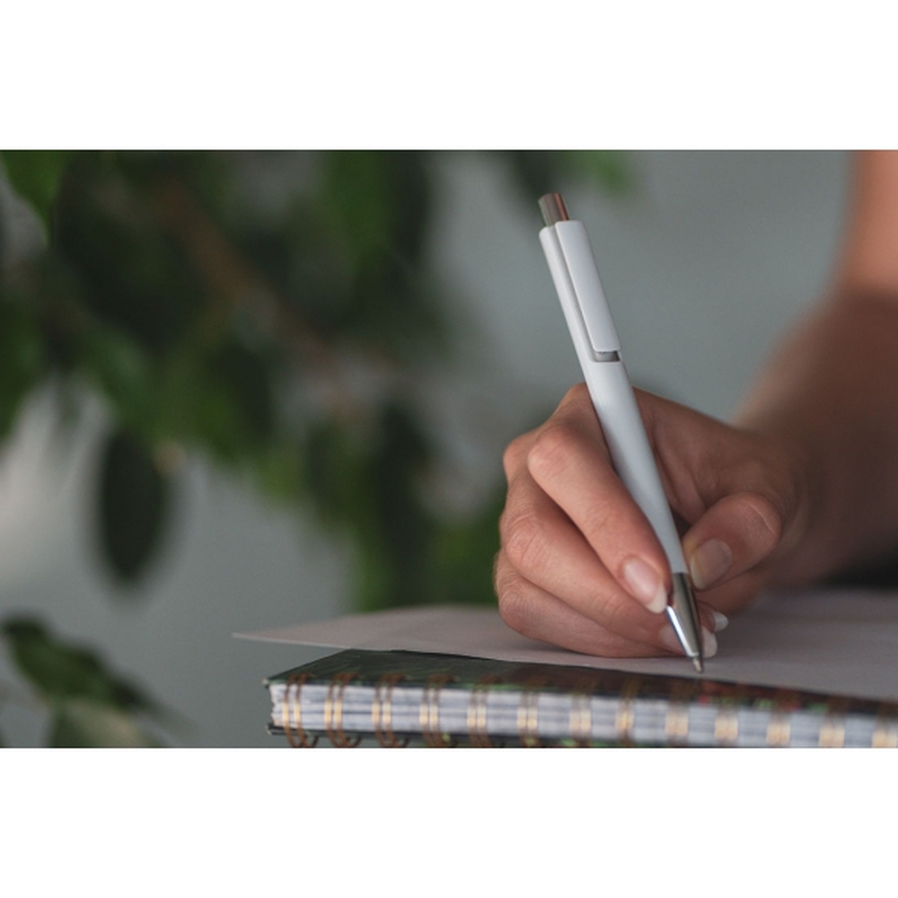 Plastic pen with blue ink combines classic design with modern details. Its slim construction ensures comfortable use, while the silver accent beneath the clip adds an elegant touch.