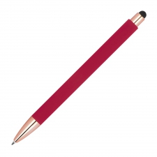 Rubberised pen with rose gold-coloured applications, blue refill, extravagant clip and touch function.