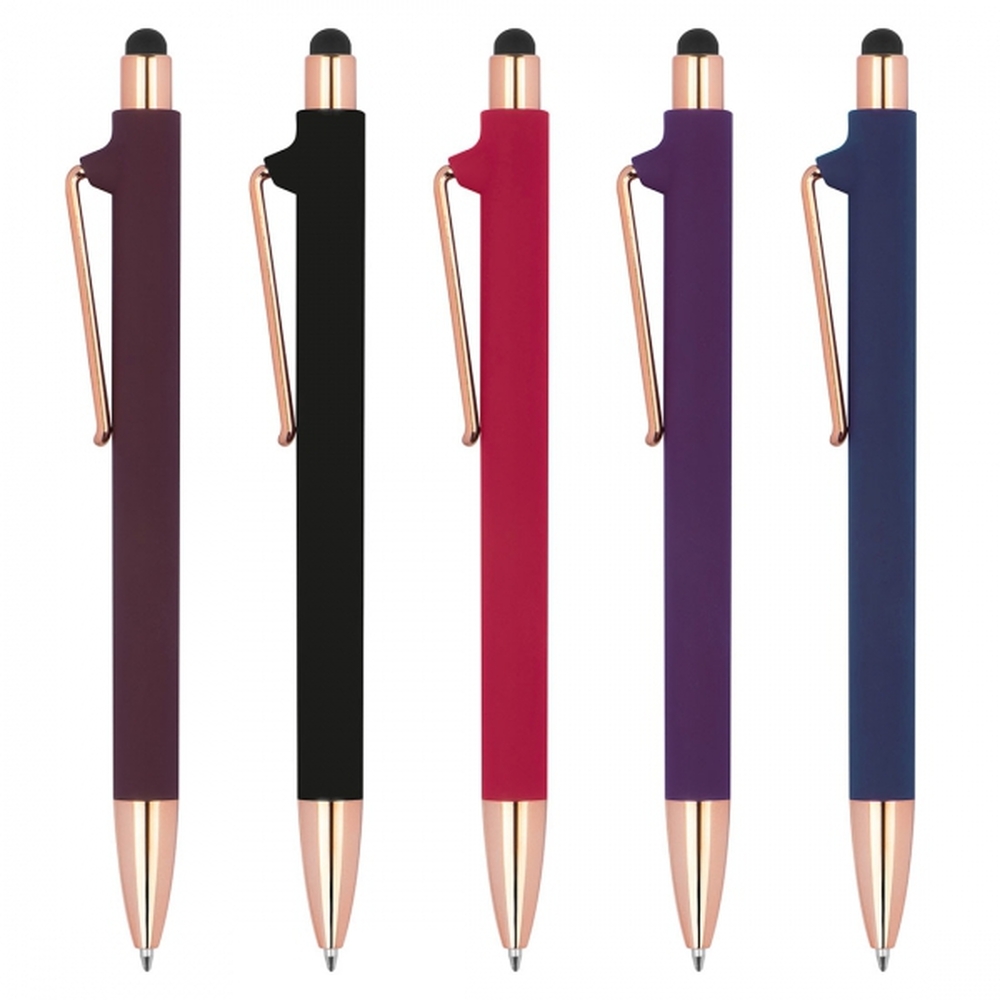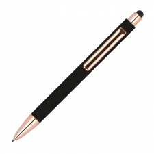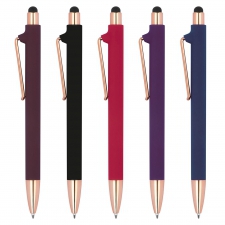 Rubberised pen with rose gold-coloured applications, blue refill, extravagant clip and touch function.