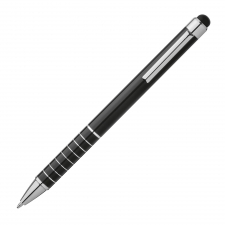Twist ball metal pen with touch function and blue writing refill. 8 engraved rings makes the writing zone convenient. Your logo will be laser engraved below the clip.